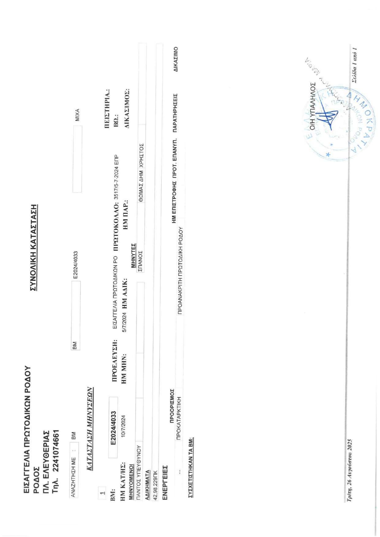 - Εισαγγελία Πρωτοδικών Ρόδου: 2074/22-04-2024 (σχετικό 20-27)
