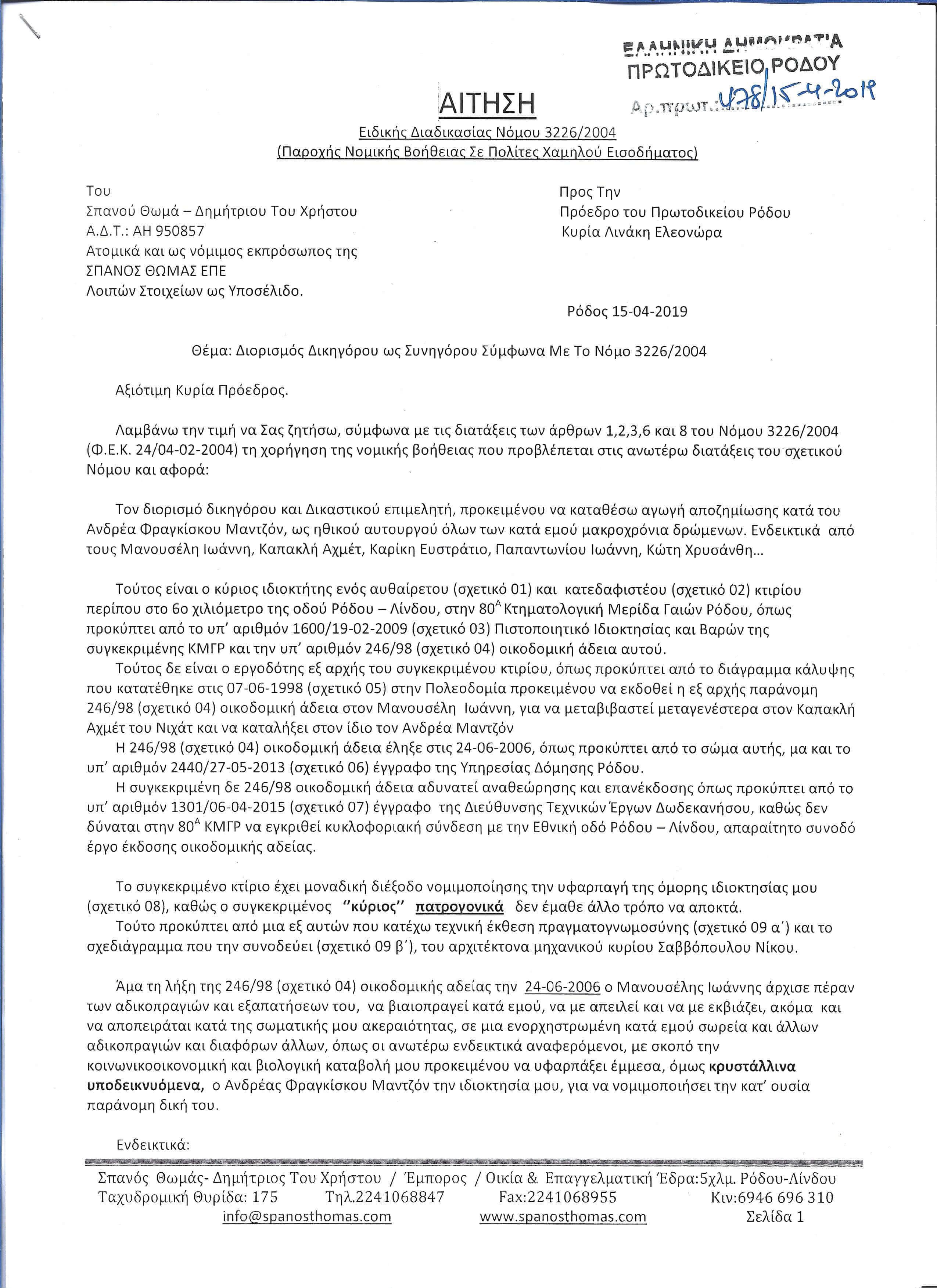 Επειδή ως έχω ήδη αναφέρει ανωτέρω η κατάσταση κυρίως με την αντιδικία μου με τον δικηγόρο Στέφανο Στεφανίδη το 2018 και σε πολιτικό και σε ποινικό επίπεδο, είχε δημιουργήσει μεγάλη ένταση στο Δικαστικό Μέγαρο και προκαλούμουν έντονα να εκτραπώ εντός αυτού, με τις όποιες για εμένα συνέπειες. Επειδή γνωστοποίησα στις δικαστικές αρχές ότι η γενεσιουργός αιτία και ο αιτιώδης σύνδεσμος όλων είναι το αυθαίρετο κτίριο του Ανδρέα Φραγκίσκου Μαντζόν το οποίο έχει μοναδική διέξοδο νομιμοποίησης την όμορη ιδιοκτησία μου. Επειδή τούτο έπραξα και διά της υπ’ αριθμόν 106/16-02-2018 (σχετικό 07-10) αίτησης μου προς την Πρόεδρο Εφετών Δωδεκανήσου, κοινοποιώντας σε Εισαγγελέα Εφετών Δωδεκανήσου και Πρωτοδικών Ρόδου, ως και στην Πρόεδρο Πρωτοδικών Ρόδου, αναφέροντας σχετικά: «Αξιότιμη Κυρία Πρόεδρος. Πρέπει να θέσω, εν τη παρούσα, για πολλοστή φορά, υπόψη Σας, όπως και στους Αξιότιμους συν-αποδέκτες της παρούσης, την γενεσιουργό αιτία όλων όσων διαχρονικά διαδραματίζονται στο χώρο της Δικαιοσύνης και ευρύτερα της Ελληνικής Πολιτείας, εκθέτοντας ενίοτε Αξιώματα και Θεσμούς τα οποία στην πλειονότητα τους επάξια υπηρετούνται και εκπροσωπούνται, όμως εκτίθενται ένεκα της αδυναμίας της Ελληνικής Πολιτείας, μάλιστα διαχρονικά, στο σύνολο της, να αντιμετωπίσει την παρανομία και να την εξαλείψει, όπως είναι σε θέση να πράξει τούτο. Ακριβολογώ. Υπάρχουν και αρκετά ευυπόληπτοι δικηγόροι του δικηγορικού συλλόγου της Ρόδου, που αναγκάστηκαν, σε ποινικά μεγάλο βαθμό να παρανομήσουν, επαναλαμβανόμενα και είναι εις γνώση της Εισαγγελίας Πρωτοδικών Ρόδου, προκειμένου να προσφέρουν τις υπηρεσίες τους σε μια δωσίλογη και κλέφτρα, την Α??? Μ??? και την οικογένεια της, για να με εκθέσουν και να με καταβάλλουν. Αξιότιμη Κυρία Πρόεδρος. Πρέπει αυτό το κακό, με τους Αξιότιμους συν αποδέκτες της παρούσης, να το σταματήσετε. Τούτο πρόκειται να σταματήσει αν αναδείξετε την γενεσιουργό αιτία όλων των μακροχρόνια, σε βάθος εικοσαετίας και πλέον, παρανομιών κατά εμού που συνοδεύονται με ευθείες απειλές και βίαιες ενέργειες κατά της σωματικής μου ακεραιότητας και της ζωής μου. Τούτη η γενεσιουργός αιτία είναι, όπως επαναλαμβανόμενα Σας έχω εκθέσει, το παράνομο και κατεδαφιστέο κτίσμα της 80Α κτηματολογικής μερίδας γαιών Ρόδου, με την παράνομη και ήδη από τις 24-06-2006 ληγμένη την ισχύ της οικοδομικής αδείας του 246/98 του Κανακάρη της Α??? Μ???, Ανδρέα Μαντζόν. Τούτο δεν έχει δυνατότητα οιασδήποτε δικαιοπραξίας και μόνη διέξοδος νομιμοποίησης του, είναι η υφαρπαγή της όμορης ιδιοκτησίας μου, (σχετικά 12 & 13). (αντίστοιχα σχετικό 02-01.) Αναφέρω υφαρπαγή γιατί η συγκεκριμένη οικογένεια δεν έχει άλλο τρόπο να αποκτήσει.»