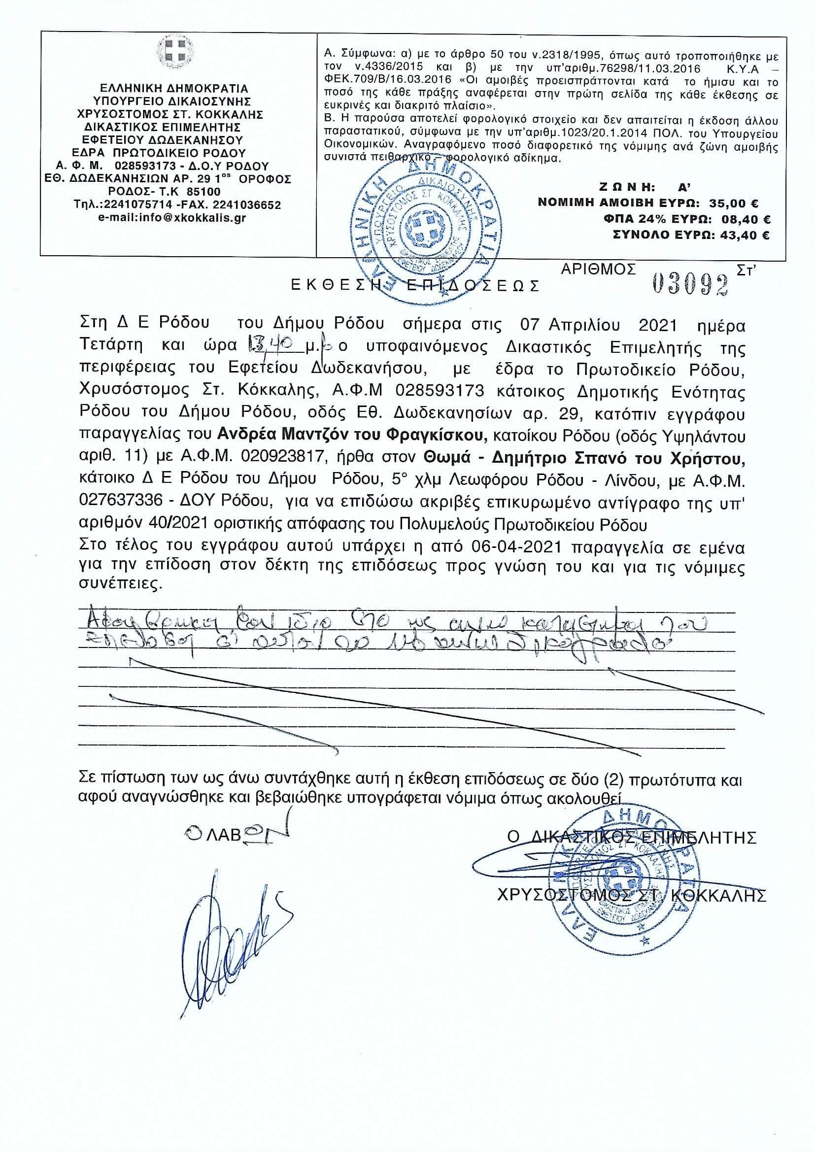 Την 30-06-2025 (σχετικό 19-10) ο δικαστικός επιμελητής Χρυσόστομος ΣΤ. Κόκκαλης μου επέδωσε την υπ’ αριθμόν 40/2021 απόφαση του Πολυμελούς Πρωτοδικείου Ρόδου με κάτωθεν αυτής το υπ’ αριθμόν 277/2025 απόγραφο και την από 25-06-2025 επιταγή του δικηγόρου Μηνά Ι. Τσέρκη. Αιτούντες ουσιαστικά, πέραν των λοιπών αιτημάτων των εναγόντων, 31.915,00 € για δικαστικά έξοδα και τα ίδια για δικηγορική αμοιβή, τουτέστιν 31.915,00 € x 2 = 63.830,00 €. Την 02-07-2025 (σχετικό 19-22) κατέθεσα την με αριθμό κατάθεσης 594/02-07-2025 στη γραμματεία του Μονομελούς Πρωτοδικείου Ρόδου ανακοπή κατά των αντιδίκων μου 1) Ανδρέα Μαντζόν του Φραγκίσκου και της Αλεξάνδρας, 2) Ειρήνης Μαντζόν του Φραγκίσκου και της Αλεξάνδρας και 3) Μαρίας Μαντζόν του Φραγκίσκου και της Αλεξάνδρας, για την ακύρωση του υπ’ αριθμόν 277/2025 απογράφου της υπ’ αριθμόν 40/2021 απόφασης του Πολυμελούς Πρωτοδικείου Ρόδου και της κάτωθι αυτής από 25-06-2025 επιταγής πληρωμής του δικηγόρου Μηνά Ι. Τσέρκη. Ορίστηκε η συζήτηση της κατά την δικάσιμο της 21-10-2025, όπου και οι αντίδικοι μου ζήτησαν αναβολή της συζήτησης της και ορίστηκε νέα δικάσιμος η 07-05-2026. Την 04-07-2025 (σχετικό 19-23) κατέθεσα την με αριθμό κατάθεσης 402/04-07-2025 στη γραμματεία του Μονομελούς Πρωτοδικείου Ρόδου αίτηση αναστολής εκτέλεσης κατά των ανωτέρω αντιδίκων μου για την αναστολή εκτέλεσης του υπ’ αριθμόν 277/2025 απογράφου της υπ’ αριθμόν 40/2021 απόφασης του Πολυμελούς Πρωτοδικείου Ρόδου και της κάτωθι αυτής από 25-06-2025 επιταγής πληρωμής του δικηγόρου Μηνά Ι. Τσέρκη, με την διαδικασία της προσωρινής διαταγής την οποία και έκανε δεκτή το δικαστήριο ορίζοντας την συζήτηση της αίτησης μου κατά την δικάσιμο της 13-01-2026, (σχετικό 19-23). Την 11-07-2025 ώρα 09:40 (σχετικό 19-24) ο δικαστικός επιμελητής Χρυσόστομος Στ. Κόκκαλης μου επέδωσε, Ενώπιον Παντός Αρμοδίου Δικαστηρίου και Αρχής, Εξώδικη Δήλωση – Παραίτηση από Επιταγή προς Εκτέλεση των αντιδίκων μου με την οποία μου δήλωσαν ότι παραιτούνται από την από 25-06-2055 επιταγή προς εκτέλεση του υπ’ αριθμόν 277/2025 απογράφου της υπ’ αριθμόν 40/2021 απόφασης του Πολυμελούς Πρωτοδικείου Ρόδου. Την συγκεκριμένη δε εξώδικη δήλωση τους δεν επέδωσαν προς την τράπεζα μου και μετά από αίτημα μου χορήγησης νομικής βοήθειας που έγινε δεκτό και αποποιήθηκαν προηγούμενα πέντε (5) δικαστικοί επιμελητές, επέδωσε τελικά ο δικαστικός επιμελητής Στέφανος Μ. Μελλίνης, διά της υπ’ αριθμόν 04334 Γ΄ έκθεσης επίδοσης του, και κατ’ εντολή του δικηγόρου Μηνά Ι. Τσέρκη, (σχετικό 19-24 α). Την 11-07-2025 ώρα 09:45 (σχετικό 19-25) ο δικαστικός επιμελητής Χρυσόστομος Στ. Κόκκαλης μου επέδωσε εκ νέου την 40/2021 απόφαση του Πολυμελούς Πρωτοδικείου Ρόδου με το υπ’ αριθμόν 277/2025 απόγραφο αυτής και την από 10-07-2025 επιταγή του δικηγόρου Μηνά Ι. Τσέρκη, χωρίς άμεσες οικονομικές απαιτήσεις των αντιδίκων μου. Την 09-09-2025 (σχετικό 19-26) κατέθεσα την με αριθμό κατάθεσης 759/09-09-2025 ανακοπή μου Ενώπιον του Μονομελούς Πρωτοδικείου Ρόδου, κατά των αντιδίκων μου για τις αξιώσεις που αυτοί εγείρουν κατά εμού διά της νέας επίδοσης της υπ’ αριθμόν 40/2021 απόφασης του Πολυμελούς Πρωτοδικείου Ρόδου και για την οποία προσδιορίστηκε η δικάσιμος της 15-01-2026. Την 10-09-2025 (σχετικό 19-27) κατέθεσα την με αριθμό κατάθεσης 545/10-09-2025 αίτηση ασφαλιστικών μέτρων, Ενώπιον του Μονομελούς Πρωτοδικείου Ρόδου, κατά των αντιδίκων μου και του υπ’ αριθμόν 277/2025 απογράφου της υπ’ αριθμόν 40/2021 αποφάσεως του Πολυμελούς Πρωτοδικείου Ρόδου και της κάτωθι αυτής από 10-07-2025 επιτα