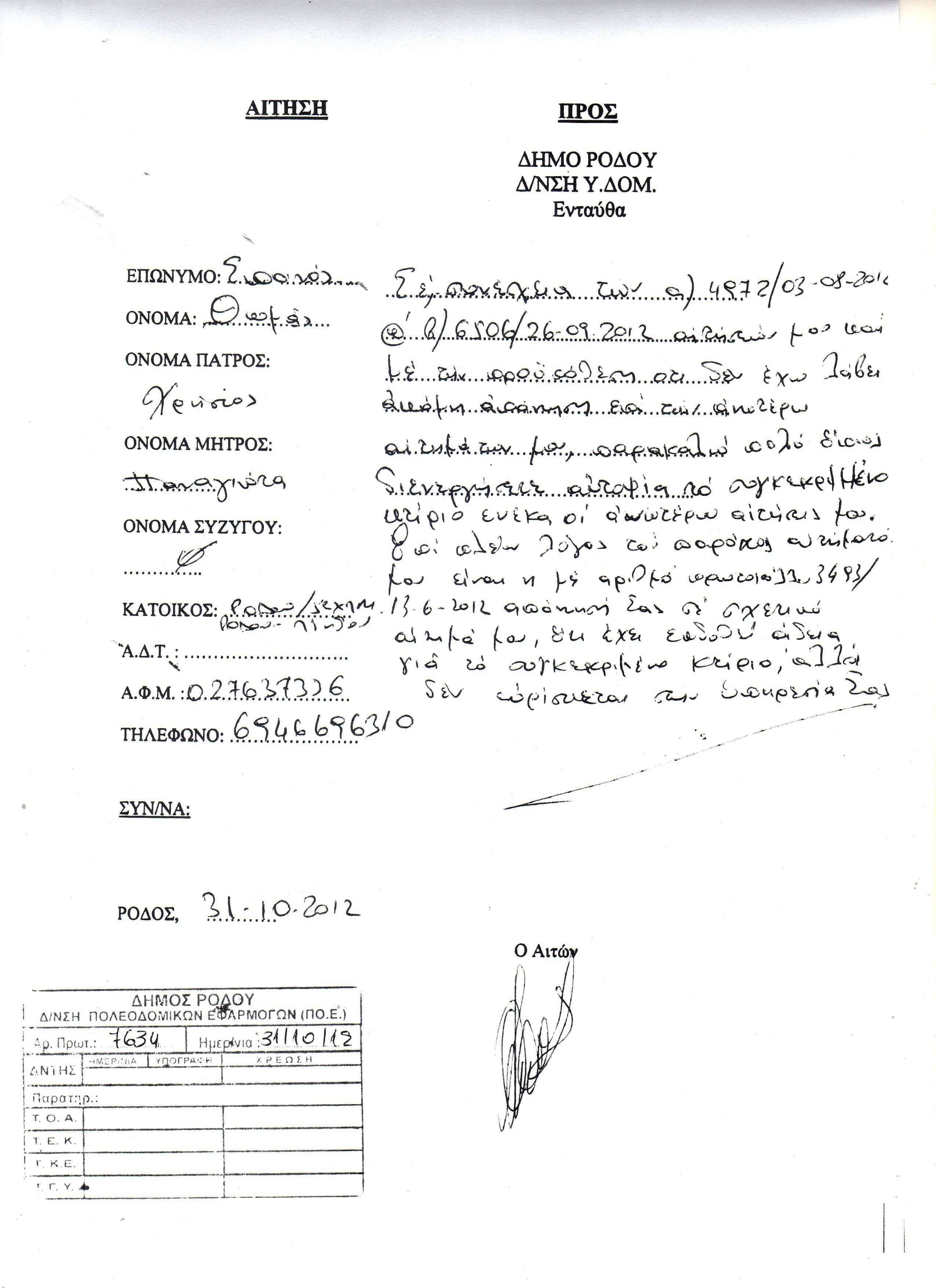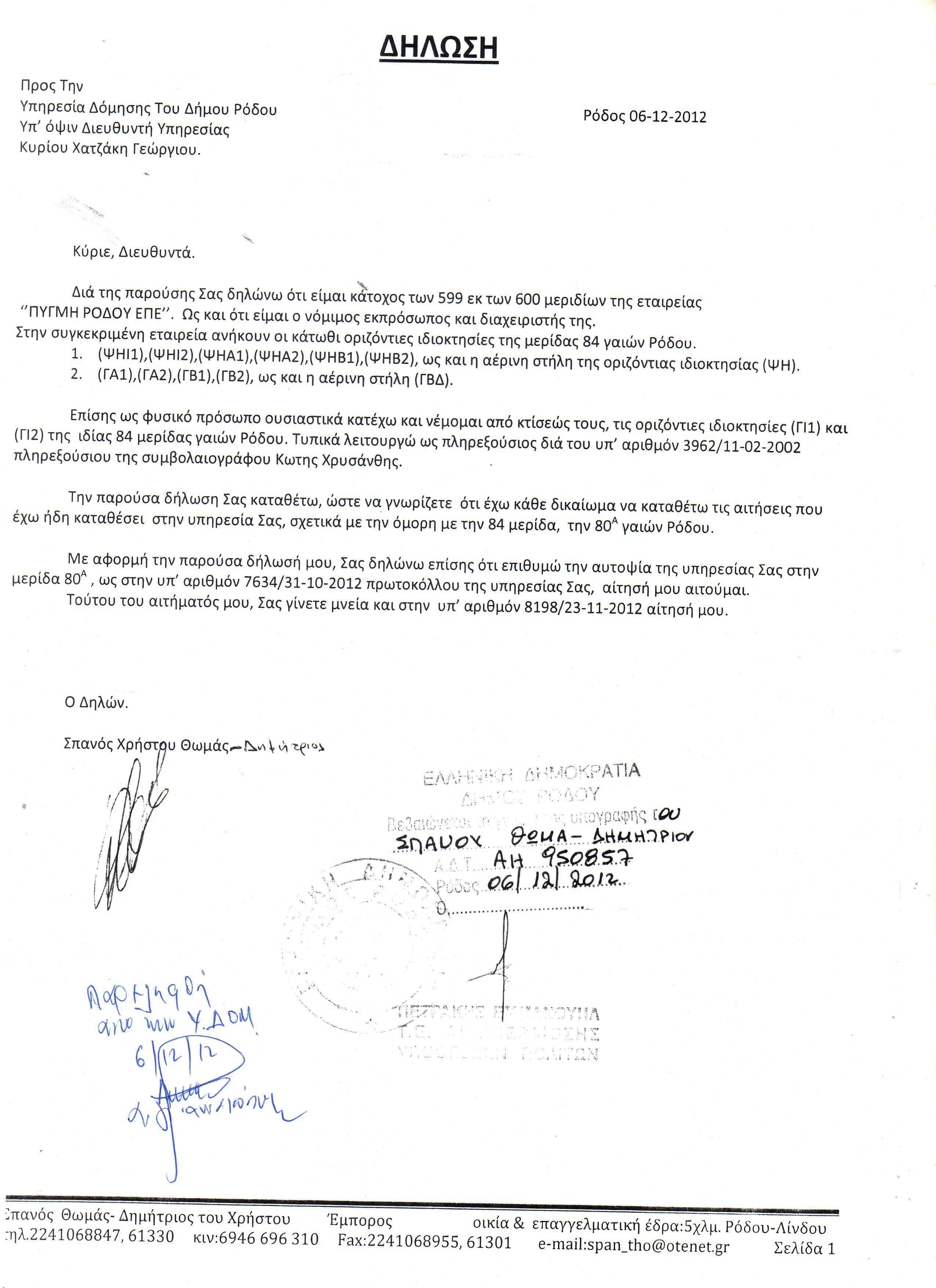 Στην Διεύθυνση Τεχνικών Έργων Δωδεκανήσου οδηγήθηκα αυθημερόν από την υπ’ αριθμόν 8506/22-02-2013 (σχετικό 03-05) απάντηση του Τμήματος Ελέγχου Κατασκευών της Διεύθυνσης Υπηρεσίας Δόμησης του Δήμου Ρόδου καταθέτοντας την υπ’ αριθμόν 887/22-02-2013 (σχετικό 05-01) αίτηση μου, αναζητώντας την αιτία των όσων υπέμενα και υπομένω ακόμη.