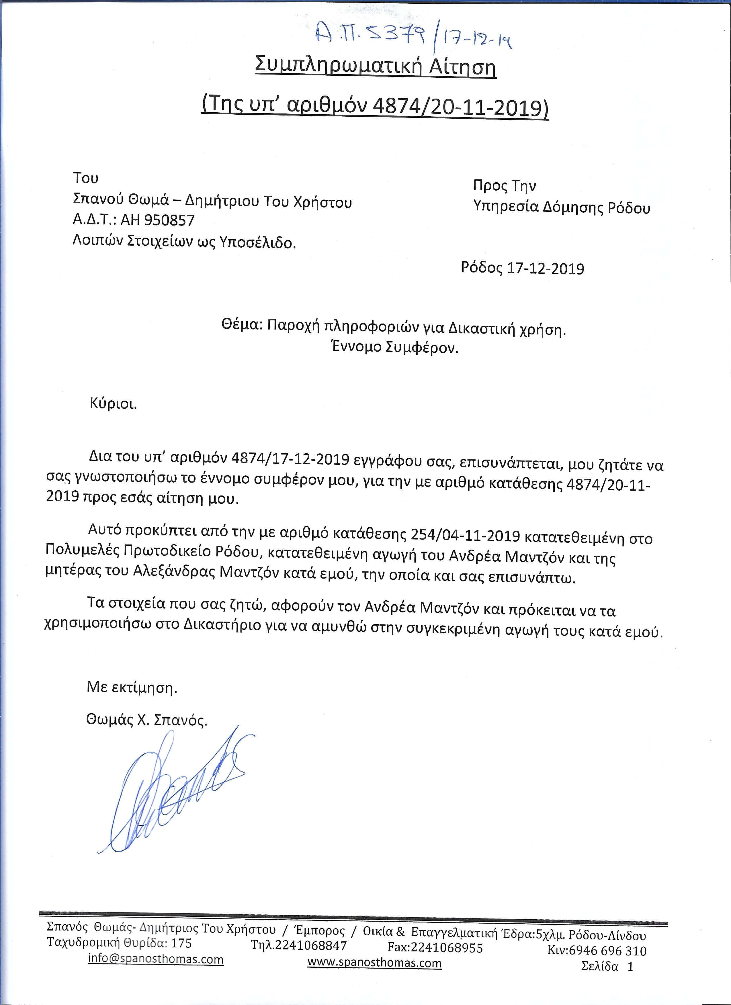 Θωμά – Δημήτριου Σπανού του Χρήστου, κατοίκου Ρόδου στο 5ο Χλμ. Ρόδου – Λίνδου, με Α.Φ.Μ.: 027637336 της Δ.Ο.Υ. Ρόδου και Α.Δ.Τ.: ΑΗ 950857, επαγγέλματος εμπόρου και εσχάτως ιδιωτικού υπαλλήλου.